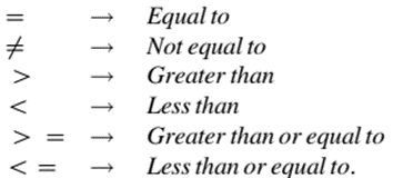 관계 연산자는 비교 목적으로 사용됩니다. VHDL 프로그래밍에서 사용할 수 있는 관계 연산자는 다음과 같습니다.