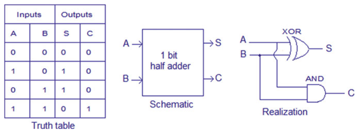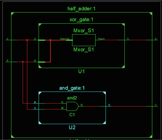 half_adder에 대한 설명은 xor_gate와 and_gate라는 다른 두 모듈의 인스턴스를 사용합니다. 개략도는 다음 그림과 같습니다.