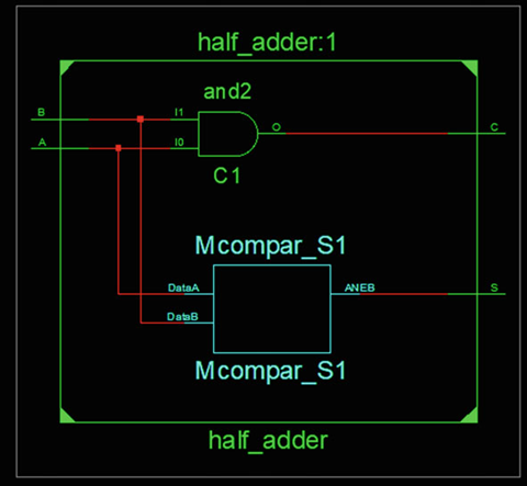 다음 예제는 'half_adder'를 유추하는 구조적 코드 스타일을 설명합니다.