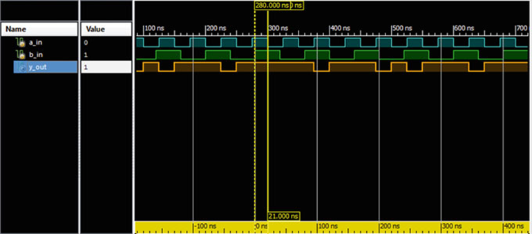 합성 도구는 감지신호 목록을 무시하고 2개의 입력 NAND 게이트를 합성 가능한 출력으로 유추하지만 시뮬레이터는 입력 b_in의 변경을 무시하고 출력 파형을 생성합니다. 이는 시뮬레이션 및 합성 불일치로 이어집니다. 합성할 수 없는 구성을 사용하는 테스트벤치는 시뮬레이션 및 합성 불일치를 보고하도록 코딩됩니다.