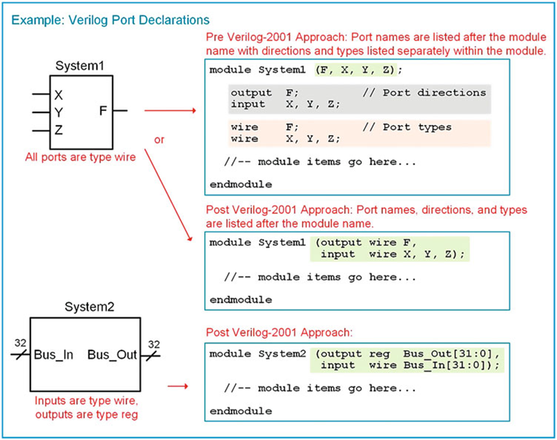 Verilog-2001 릴리스부터 포트 방향 및 유형은 모듈 이름 뒤의 괄호 안에 포트 이름과 함께 포함될 수 있습니다. 이 접근 방식은 시스템에 입력/출력을 전달하는 ANSCI-C 접근 방식을 더 많이 모방했습니다.