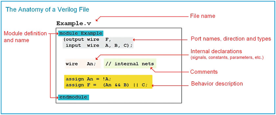 Verilog 디자인은 단일 파일에 단일 시스템을 설명합니다. 파일에는 *.v 접미사가 있습니다. 파일 내에서 시스템 설명은 모듈 내에 포함됩니다. 모듈에는 시스템에 대한 인터페이스(즉, 입력 및 출력)와 동작 설명이 포함됩니다.