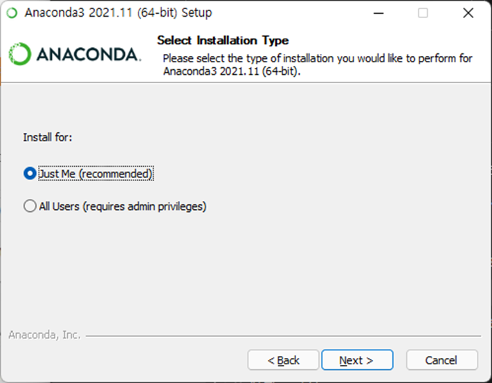 4. Installation Type 선택 다이얼로그가 열리면 “Just Me”라디오 버튼을 클릭하고 “Next”버튼을 클릭하세요.
