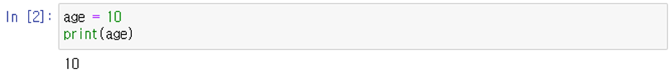 파이썬에서 구문은 가장 작은 단위의 실행코드입니다. 식별자에 값을 할당했을 때 구문이 쓰여집니다. 아래 첫번째 문장은 age 식별자에 숫자 10을 할당합니다. 두번째 문장은 age 식별자를 출력합니다.