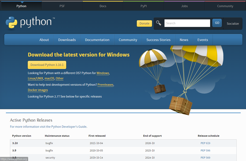 1. 파이썬 공식 홈페이지에서 윈도우용 파이썬 언어 패키지를 다운로드 합니다.