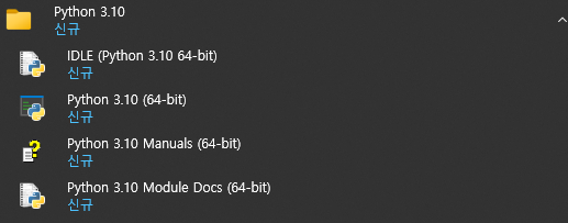 [윈도우 시작 --> 모든 앱 --> Python 3.10]에 설치된 항목을 볼 수 있습니다.