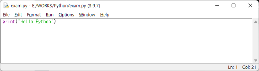 3. IDLE 에디터에 print(“Hello Python”)을 입력하고 “Run --> Run Module”을 선택하면 먼저 저장하라는 대화상자가 나타납니다. 파일을 저장하면 IDLE Shell창에 실행 결과가 나타납니다.