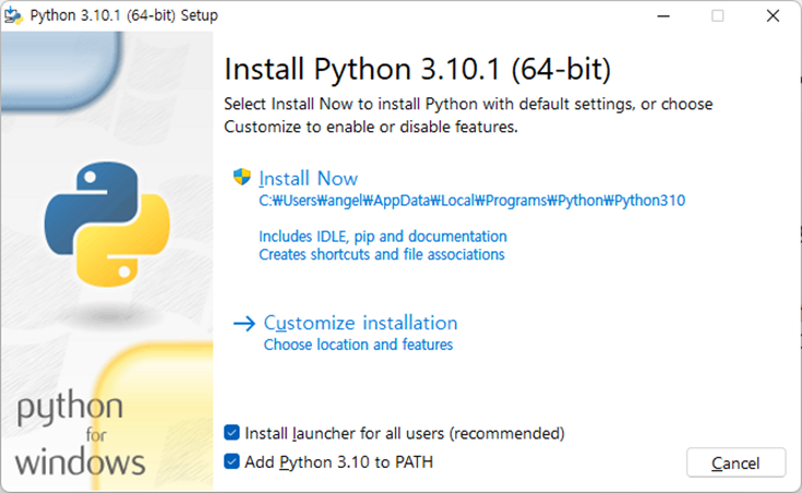 2. 다운로드 받은 인스톨 파일을 더블클릭하면 설치 프로그램이 실행됩니다. 파이썬이 어느곳에서든 실행될 수 있도록 ‘Add Python 3.10 to PATH’ 옵션을 선택해야 합니다. 그 다음 Install Now를 클릭하면 설치가 시작됩니다.