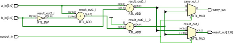 RTL은 합성 가능한 구조를 사용하여 4비트 가산기 및 감산기를 구현하도록 코딩됩니다. control_in = 1이면 덧셈을 수행하고 control_in = 0인 경우 빼기를 수행합니다.