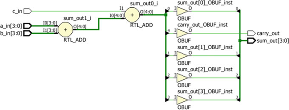 다음 예는 4비트 가산기에 대해 코딩된 RTL의 합성 결과이며, 4비트 가산기의 입력 포트는 a_in, b_in, c_in, 출력 포트는 sum_out, carry_out으로 명명하였습니다.