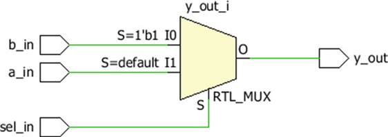 2:1 MUX에는 2개의 입력 라인이 있습니다. 하나는 선택 라인이고 다른 하나는 출력 라인입니다. sel_in 입력이 논리 0일 때 출력 y_out은 a_in으로 할당되고 출력은 논리 1과 동일한 sel_in에 대해 b_in으로 할당됩니다.