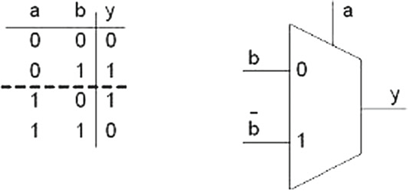MUX를 범용 로직을 사용하는 이유는 이해하기 쉽고 구조가 간단하기 때문입니다. 다음 그림은 2:1 MUX를 사용하여 2개의 입력 XOR 논리 게이트를 구현하는 방법을 이해하는 데 유용합니다. XOR 논리 게이트에 두 개의 입력 a, b 및 출력 y가 있다고 가정합니다.
